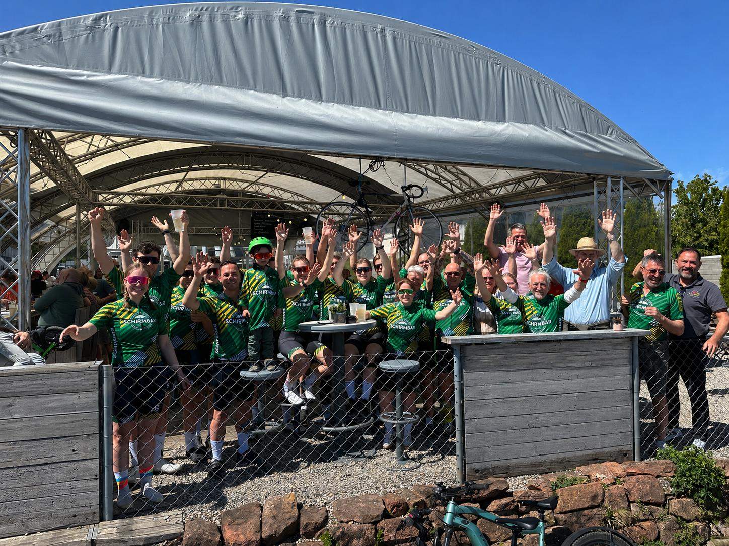 Rundum glücklich ist auch Bernd Pfeffer von der Schirmbar am Deutschen Weintor, der im vergangenen Jahr mit seinem neu gegründeten Schirmbar-Vitus-Team um die aus dem Raum Mönchengladbach stammende und bekennende Südpfalz-Urlaubs-Familie Froneberger erstmals an den Start ging. Dieses Jahr sind auch 3 Pfälzer mit im 17-köpfigen Team über das 50-Km-Jedermanns-Rennen gewesen. Heide aus NW mit ihren 77 Jahren, Albert Getto aus dem benachbarten Oberotterbach und Andreas Weidner aus Steinweiler. Dazu gesellte sich noch kurzfristig Winzer Florian Geißer aus dem Austragungsort Schweigen.